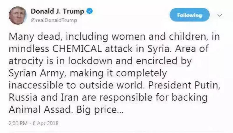 特朗普在推特上直呼阿萨德为“畜生”(Animal)