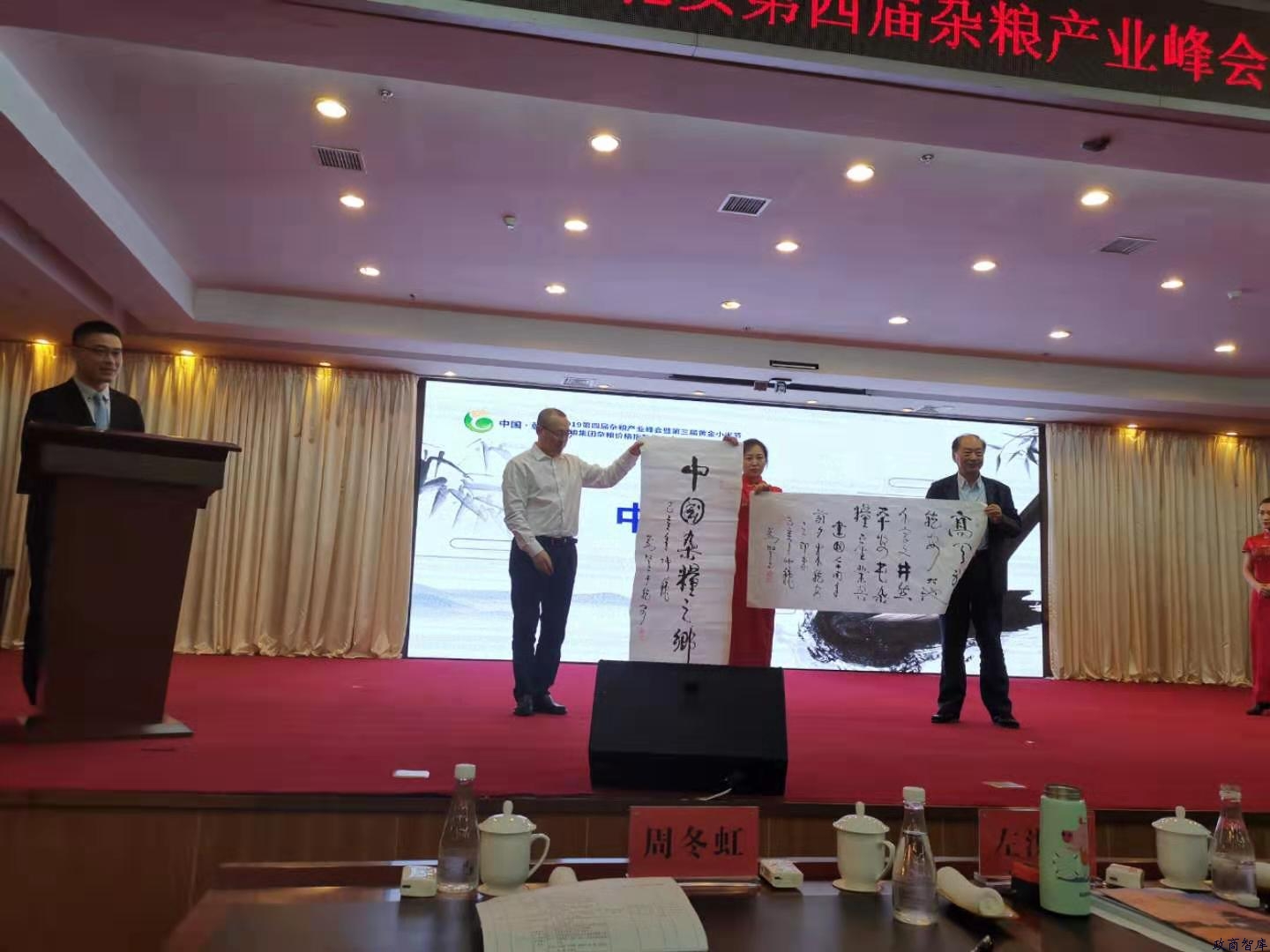 刘坚部长赠送乾安“中国杂粮之乡”墨宝,乾安县委书记娄选东代表乾安接受赠送并展示