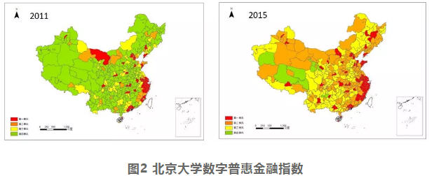 我们还做了北京大学数字普惠金融指数(图2),左边是2011年的数据,右边是2015年的数据,在这个图上面,我们把所有地级市划分成四个层级。